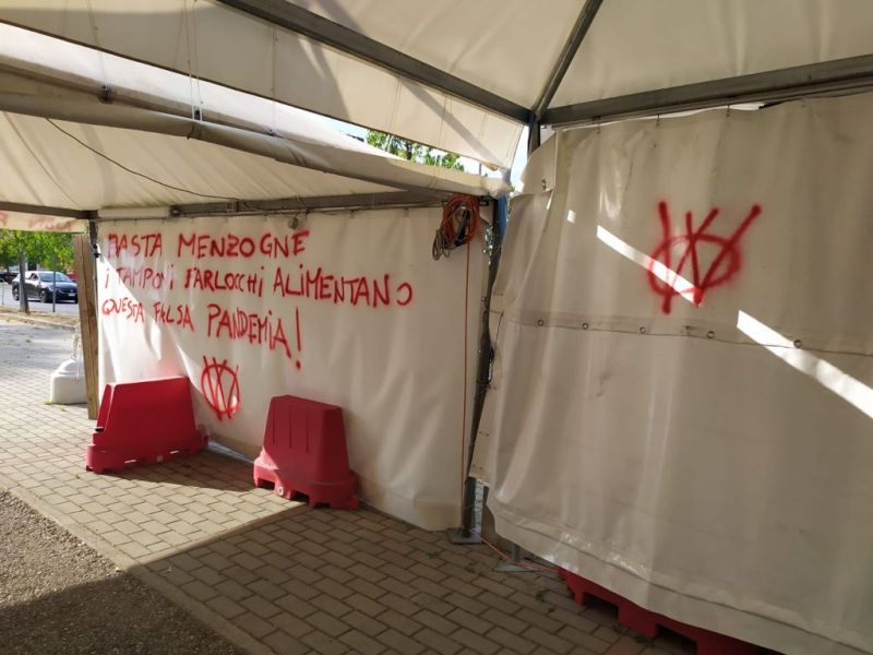 Stavolta ad essere imbrattati sono i gazebo in via San Mamante, vicino al centro commerciale. "Basta menzogne, i tamponi farlocchi alimentano questa falsa pandemia", è una delle frasi che che sono state scritte con lo spray rosso sul tendone, riconducibile al gruppo denominato "V_V". E poi ancora marchiato dai segni rossi il bordo del gazebo, proprio all'ingresso, con la scritta "non fate il tampone".