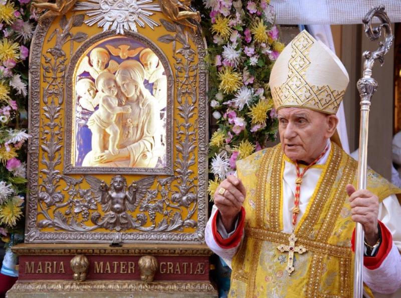 La Santa Messa presieduta dal Porporato, è stata celebrata all’aperto nel chiostro del Santuario, per l’occasione è stata collocata straordinariamente la Sacra Effige della Beata Vergine, all’esterno della Chiesa ai cui piedi, il Cardinale a lungo si è soffermato inginocchiato a pregare.