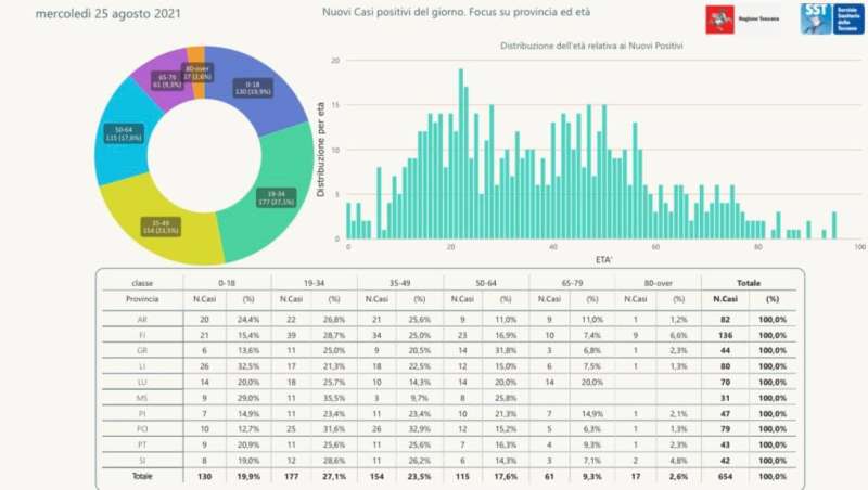 L'età media dei 654 nuovi positivi odierni è di 38 anni circa (22% ha meno di 20 anni, 32% tra 20 e 39 anni, 31% tra 40 e 59 anni, 13% tra 60 e 79 anni, 2% ha 80 anni o più).