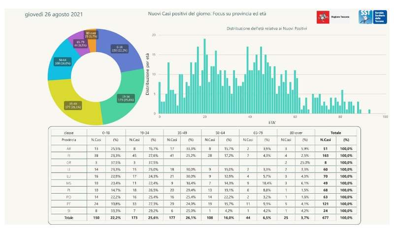 L'età media dei 677 nuovi positivi odierni è di 36 anni circa (25% ha meno di 20 anni, 30% tra 20 e 39 anni, 31% tra 40 e 59 anni, 10% tra 60 e 79 anni, 4% ha 80 anni o più).
