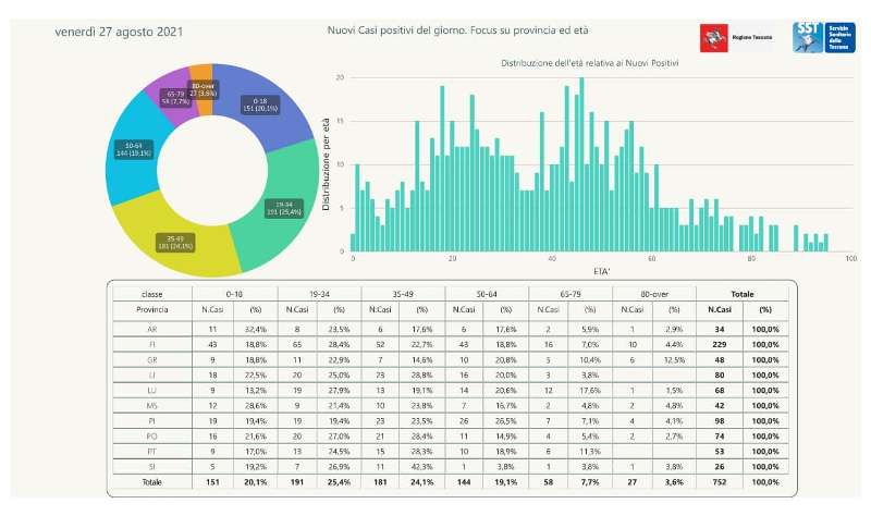 L'età media dei 752 nuovi positivi odierni è di 38 anni circa (22% ha meno di 20 anni, 30% tra 20 e 39 anni, 33% tra 40 e 59 anni, 12% tra 60 e 79 anni, 3% ha 80 anni o più).