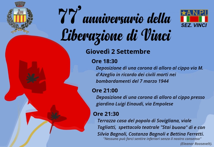La commemorazione ufficiale dell'Anniversario della Liberazione di Vinci avrà luogo giovedì 2 settembre a partire dalle ore 18.30 con la deposizione di una corona di alloro, da parte dell'Amministrazione comunale, presso il cippo di via M. D'Azeglio, in ricordo dei civili morti nei bombardamenti del 7 marzo del 1944. Alle ore 21 una seconda corona d'alloro verrà deposta al cippo presso il giardino “Luigi Einaudi” in via Empolese a Spicchio-Sovigliana.