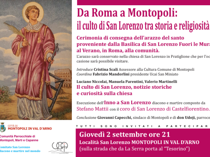 Da Montopoli a Roma e ritorno, nel segno di San Lorenzo. Un arazzo raffigurante il diacono Lorenzo sarà portato e consegnato direttamente dalla basilica di San Lorenzo al Verano a Roma, dove sono custodite le spoglie del santo, giovedì 2 settembre alle 21, nell'oratorio di San Lorenzo a Pratiglione.