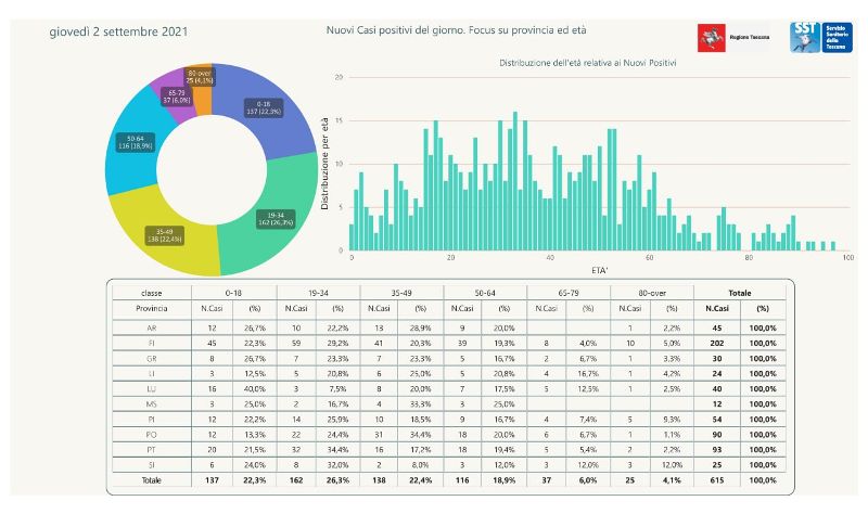 I nuovi casi registrati in Toscana sono 615 su 18.424 test di cui 9.045 tamponi molecolari e 9.379 test rapidi. Il tasso dei nuovi positivi è 3,34% (8,5% sulle prime diagnosi). Più di un quarto dei contagiati è nella fascia 19-34 anni.