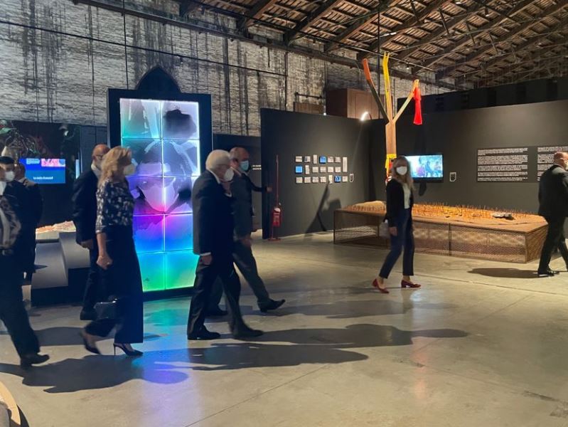Mattarella, in particolare, è stato fotografato di fronte all’opera multimediale “Lane”, composta ma moduli in porcellana luminosi e opera dell’artista Nicola Boccini nata in collaborazione con il fumettista pecciolese Riccardo Burchielli. Lo stesso Boccini che, con l’opera il “Giudizio Universale”, è protagonista nella chiesa di Legoli, visitabile fino all’11 gennaio 2022. Il Presidente è stato accompagnato dal presidente della Biennale, Roberto Cicutto, e dal curatore Hashim Sarkis.
