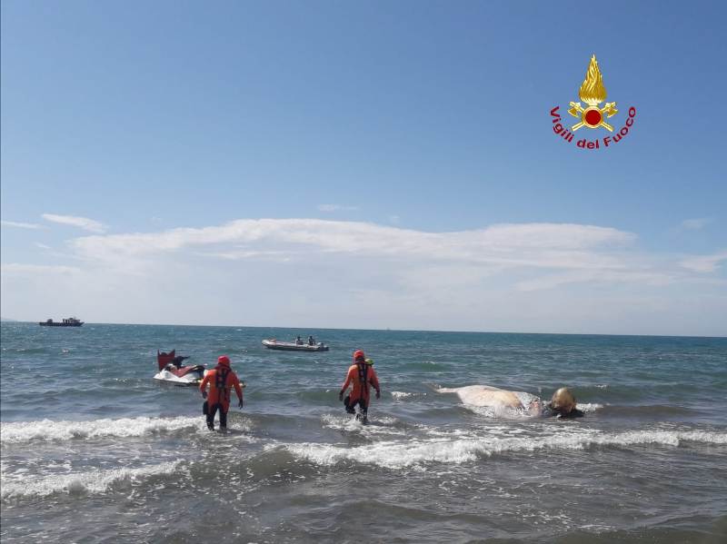 Nelle acque della località Giannella stanno intervenendo per il recupero del corpo dell'animale, i vigili del fuoco del comando di Grosseto distaccamento di Orbetello, il personale del soccorso acquatico su moto d'acqua e il nucleo sommozzatori di Firenze, sotto il coordinamento dell'ufficio circondariale marittimo di Porto Santo Stefano.