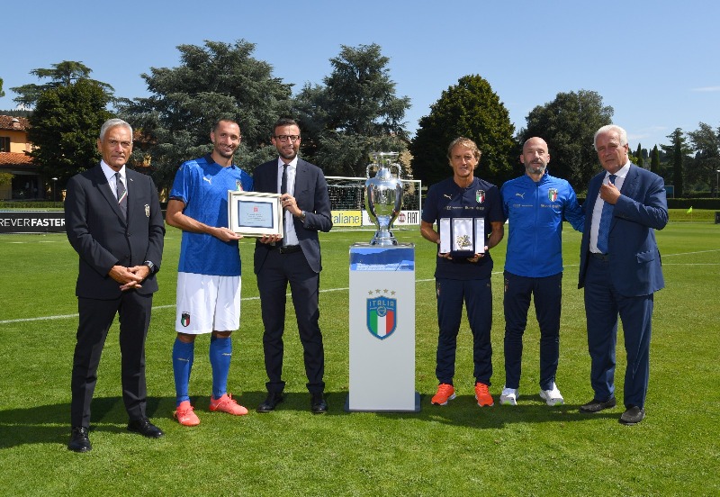 La Nazionale campione d’Europa ha avuto oggi, venerdì 3 settembre, il giusto riconoscimento da parte della Regione Toscana e del Consiglio regionale. Le notti magiche dell’Italia sono partite da Coverciano e nel centro tecnico federale il governatore Eugenio Giani e il presidente dell’Assemblea legislativa Antonio Mazzeo hanno premiato gli azzurri rappresentati dal ct Roberto Mancini e dal capitano Giorgio Chiellini, simbolo di una Toscana vincente e legata alle tradizioni.