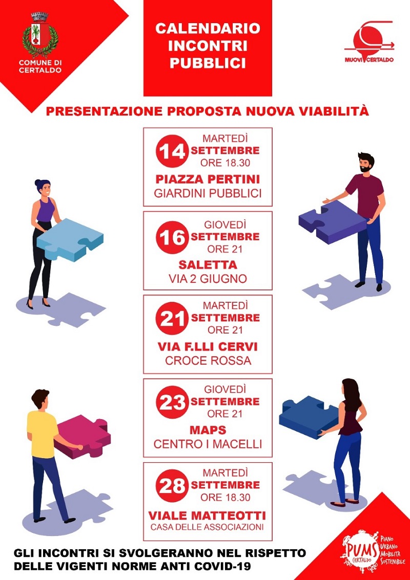 La prima tappa del calendario, che mette al centro il Piano urbano mobilità sostenibile (Pums Certaldo), si svolgerà il 14 settembre alle 18.30 in piazza Pertini nei giardini pubblici. Gli incontri, tutti nel mese di settembre e alla presenza del sindaco Giacomo Cucini, proseguiranno poi giovedì 16 settembre alle 21 nella saletta di via 2 Giugno, martedì 21 settembre alle 21, in via Fratelli Cervi negli spazi della Croce Rossa Italiana, giovedì 23 settembre, alla stessa ora, al centro I Macelli e, infine, martedì 28 settembre alle 18.30 alla Casa delle associazioni in viale Matteotti.