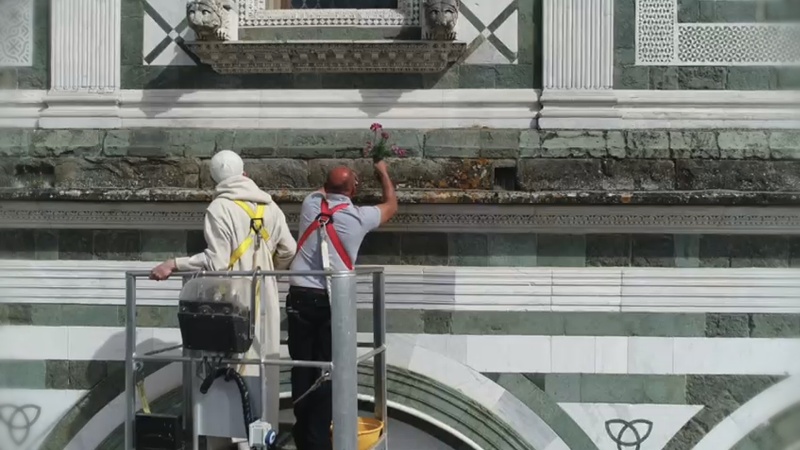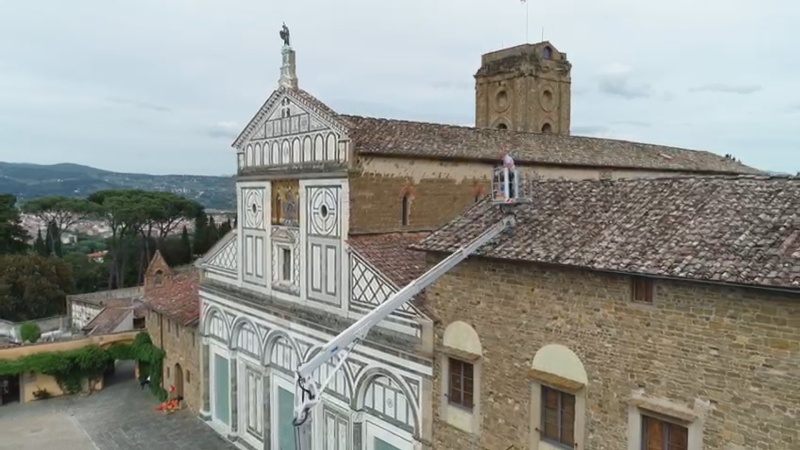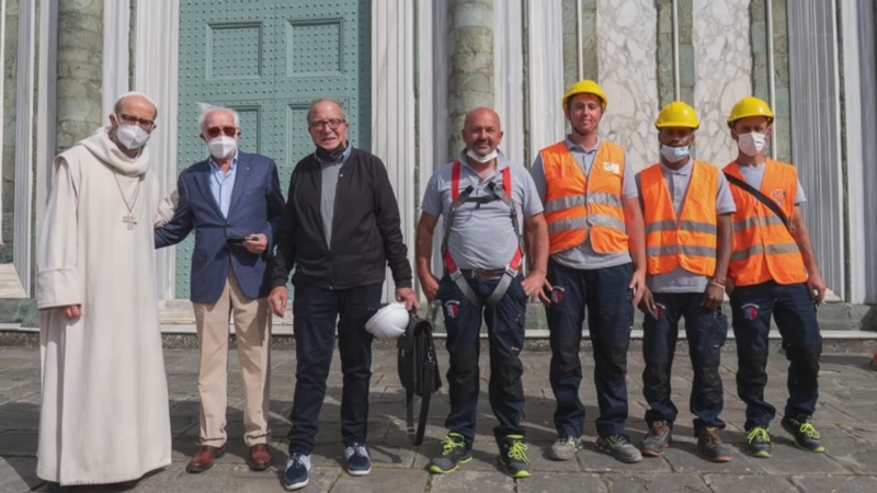 “Dopo aver fatto un’indagine conoscitiva di tutto il tetto per poi andare a lavorare in maniera puntiforme sui canali, sulle gronde ma anche sui marmi della facciata, dove c’erano problemi di crescita di erbe. – spiega Fabio Braccianti, architetto e socio RC Firenze Lorenzo il Magnifico – Ho lavorato con un piano di sicurezza in modo da poter intervenire anche in presenza, oltre che degli operai dell’impresa, anche dei turisti, dei monaci che circolavano nella piazza. Un’opera propedeutica in modo che in futuro non ci siano problemi legati a bagnamenti o percolazioni interne”