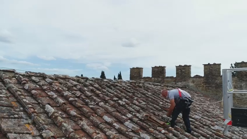 La Ditta edile incaricata e’ stata la Combaj Pllumb di Terranuova Bracciolini (Arezzo), essa ha operato con estrema perizia e con mezzi speciali per i lavori in quota, ovvero: autogru con sistema di elavatore di cestello per 2 uomini (asportando con precisione la grande quantita’ di elementi invasivi). Si ricorda che in fase iniziale e’ stato effettuato un sopralluogo con ampio rilievo fotografico d’indagine su tutta la copertura con l’ausilio di un drone ( per individuare esattamente le zone dove operare).