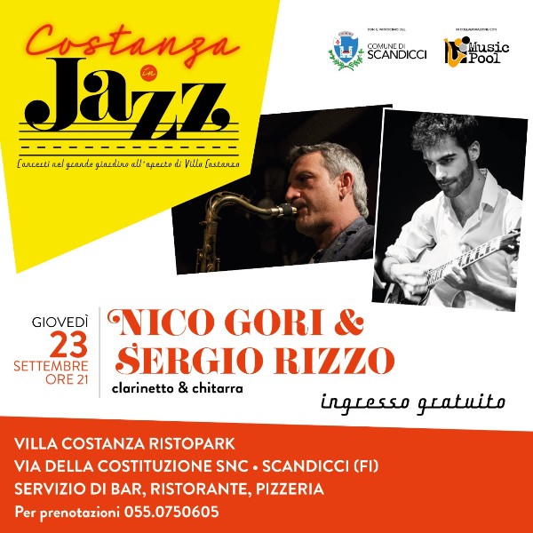 Potremo ammirare il duo formato da Nico Gori & Sergio Rizzo (clarinetto & chitarra), in programma giovedì 23 settembre e pronto ad esplorare le diverse possibilità della sonorità drumless; ispirandosi al trio di Jimmy Giuffrè quanto allo swing acustico di Django Reinhardt, per un repertorio che attraversa il songbook americano, il jazz manouche e la musica latina.