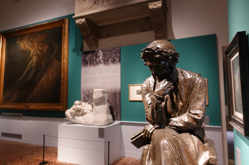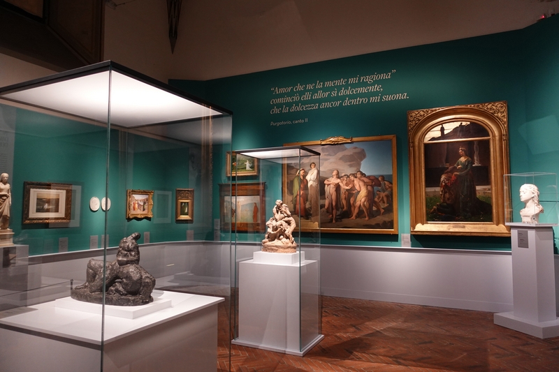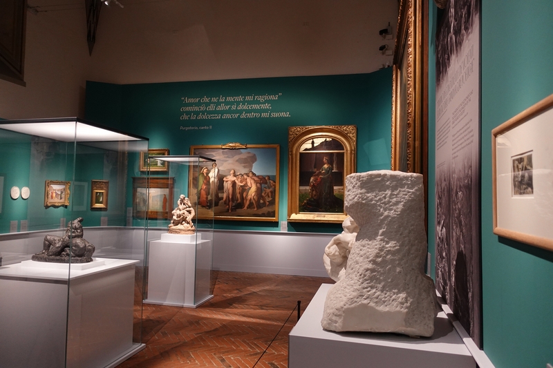 Tra le opere in mostra capolavori di protagonisti assoluti del periodo tra i quali Giovanni Duprè, Amos Cassioli, Gustave Doré, Auguste Rodin, Jean-Baptiste Carpeaux, Emile-Antoine Bourdelle. L’itinerario si sofferma inoltre su due grandi imprese editoriali: il Concorso Alinari per l’illustrazione della Divina Commedia del 1900 a cui parteciparono tra gli altri anche Giovanni Fattori, Galileo Chini e Plinio Nomellini e l’edizione della Commedia pubblicata nel 1911 da Leo S. Olschki. La prima convocò gli artisti intorno all’illustrazione del poema con risultati coerenti con la contemporanea temperie simbolista, la seconda, definita “monumentale”, vide come protagonista Gabriele D’Annunzio chiamato a scrivere l’introduzione al prezioso volume.
