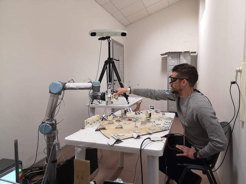 Ma come avviene concretamente la comunicazione tra la persona e il robot? “Attraverso un braccialetto – continua Controzzi – che sarà indossato dall’operatore e che vibrerà quando il robot richiede il passaggio di un oggetto”. Il robot è dotato di un sistema di visione che monitora il movimento dell’uomo: quando l’uomo è nella fase giusta per ricevere l’oggetto, il robot invia un segnale al bracciale che rilascia una breve vibrazione. Questo tipo di segnale aptico permetterà inoltre di aggirare le problematiche che possono derivare dall’utilizzo di segnali acustici e luminosi, non facilmente individuabili in un contesto caotico come può essere quello di un’industria.