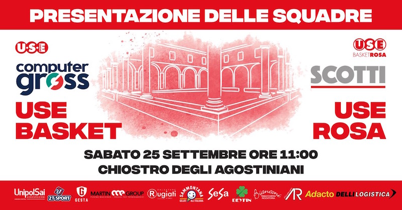 La cornice del chiostro degli Agostiniani ospiterà sabato 25 settembre alle 11 la presentazione delle prime squadre biancorosse: Use Rosa Scotti, Use Computer Gross e Biancorosso Sesa. Saranno presenti gli atleti, gli allenatori, la dirigenza e gli sponsor. Nell'occasione saranno presentate anche le nuove divise da gioco realizzate dalla Due T.