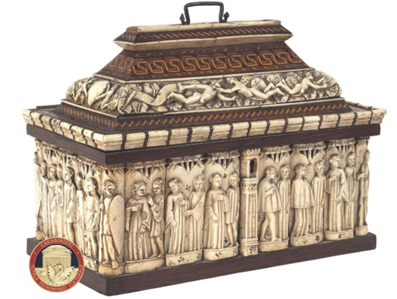 Il bene, risalente al 19esimo secolo e riferibile allo stile della "Bottega degli Embriachi" attiva a Venezia tra il 14 e 15esimo secolo, fu rubato nel novembre 1997 da due soggetti, distraendo il personale della galleria di antiquariato, riuscirono a portarlo via. Il cofanetto è stato sequestrato poi presso una casa d'aste romana, in seguito ad alcuni accertamenti sui beni d'arte pubblicati in cataloghi online: le verifiche dei militari della Sezione Elaborazione Dati del Comando TPC, hanno consentito di accertarne l’illecita provenienza.