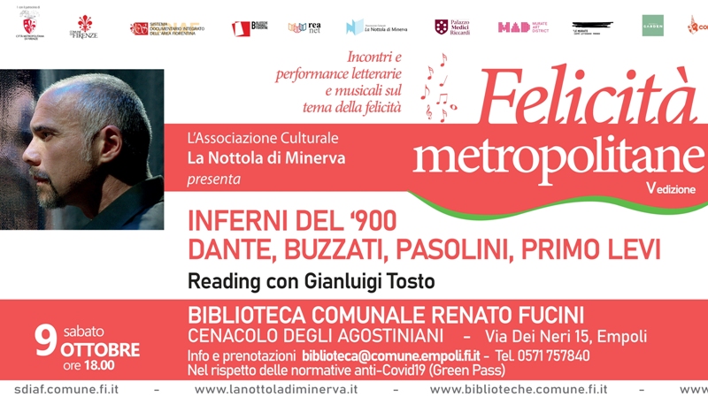 L’evento presentato sarà un reading con Gianluigi Tosto dal titolo ‘Inferni del ‘900. Dante, Buzzati, Pasolini, Primo Levi’.