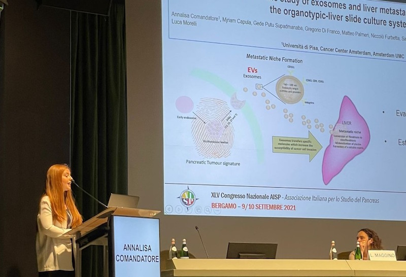 La ricerca, dal titolo: “An innovative model for the study of exosomes and liver metastases from pancreatic cancer: the organotypic-liver slide culture system”, è stata presentata dalla dottoressa Annalisa Comandatore, specializzanda in Chirurgia generale all’Università di Pisa, attualmente visiting fellow all’Ospedale di Amsterdam UMC, ed è stata possibile sia grazie alla collaborazione scientifica e pluriennale esperienza dei due gruppi di ricerca sul tumore del pancreas, sia grazie al Global Grant della Rotary Foundation, ottenuto dal Rotary Club Pisa (presieduto dal dottor Sandro Sgalippa) sul progetto di ricerca presentato dalla dottoressa Comandatore, dal titolo “Bench-to-bedside studies on the role of exosomes for the individualized selection of effective drugs against pancreatic cancer” – “Studi traslazionali sul ruolo degli esosomi per lo sviluppo di approcci terapeutici personalizzati per i tumori pancreatici”, di cui è responsabile scientifico a Pisa Luca Morelli, professore associato di Chirurgia all’Università di Pisa e chirurgo nella Sezione dipartimentale di Chirurgia generale dell’Aoup (diretta dal professore Giulio Di Candio).