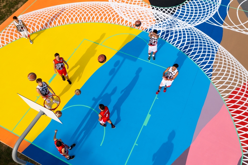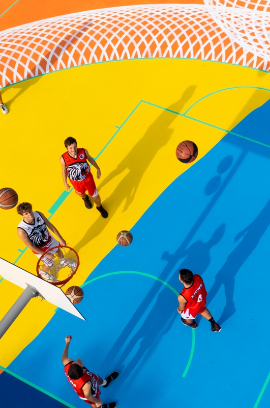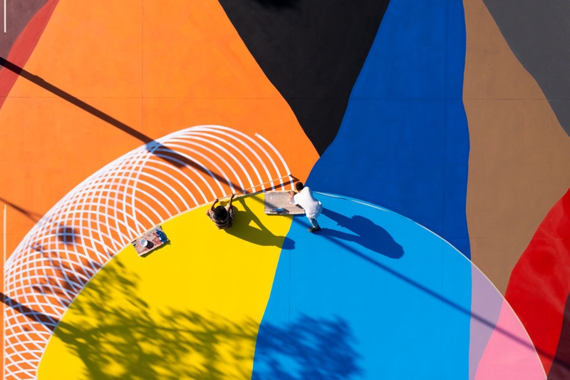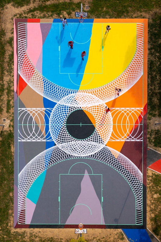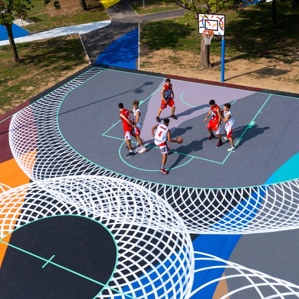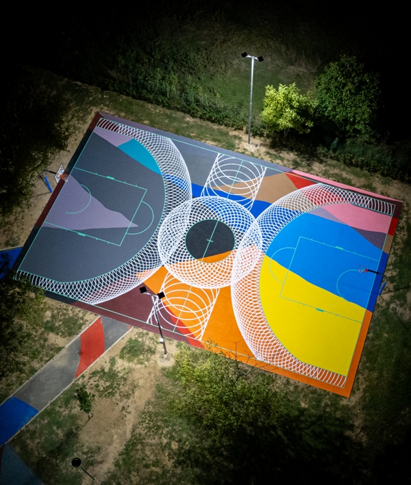 L'artista Moneyless ha lavorato sul manto di gioco del campo, che è stato completamente rifatto dall'amministrazione comunale utilizzando i prodotti di un'azienda leader mondiale nella produzione di resine acriliche per superfici sportive. «Per decorare il campo da basket sono stati usati prodotti certificati e anti-scivolo che, oltre alla resa artistica, garantiranno la sicurezza dei ragazzi che giocheranno nello spazio», spiega Alberto Cosmelli di Mapei.