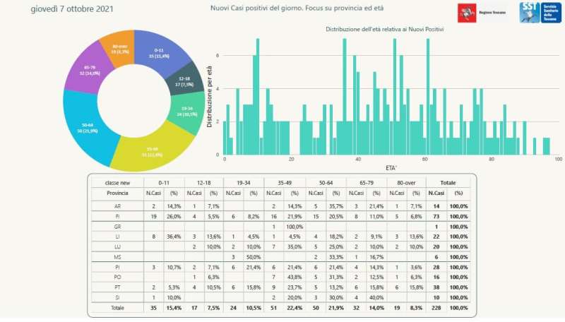 L'età media dei 228 nuovi positivi odierni è di 44 anni circa (24% ha meno di 20 anni, 18% tra 20 e 39 anni, 29% tra 40 e 59 anni, 21% tra 60 e 79 anni, 8% ha 80 anni o più).