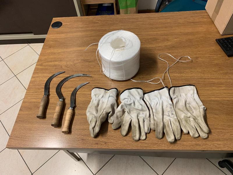 Dalla successiva ispezione dei luoghi venivano rinvenuti anche i guanti e le roncole utilizzate per tagliare le piante, nonché altre piante raccolte a fasci e legati con della corda in nylon e posti a ridosso della strada sterrata, pronti per essere caricati probabilmente sullo stesso furgone che aveva condotto i rei sul posto poche ore prima.
