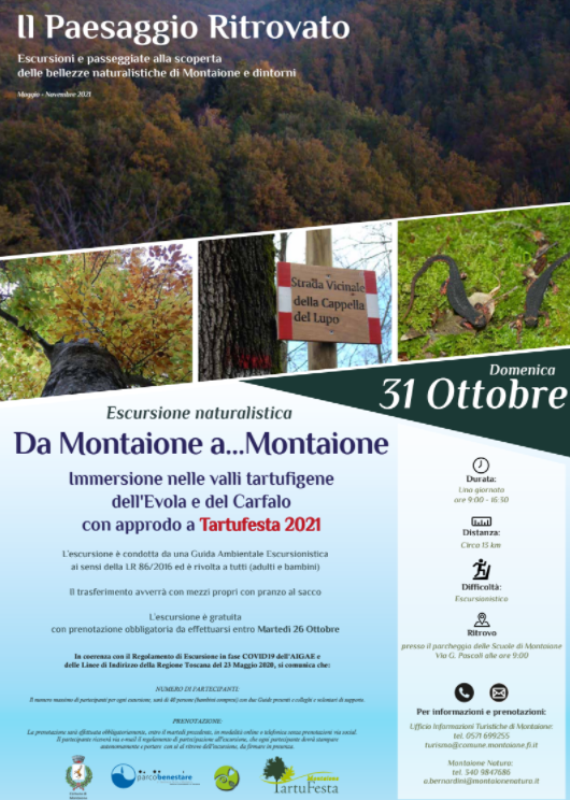 Nella giornata della Tartufesta, gli escursionisti accompagnati da una guida ambientale percorreranno i sentieri che si snodano lungo le valli tartufigene dei torrenti Evola e Carfalo. In questi splendidi luoghi è possibile ammirare i “pozzi” dell'Evola e la caratteristica flora e fauna che popola il Parco Naturale del Carfalo. Al termine dell'escursione i partecipanti potranno gustare le delizie e i sapori del tartufo nei vari stand presenti nel centro storico di Montaione.