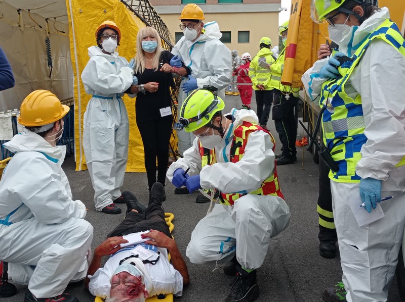 L’esercitazione ha avuto inizio con la simulazione di un incidente con tre mezzi coinvolti: un pulmino, un’autovettura e un furgone che trasportava sostanze pericolose (radioattive), con venti persone coinvolte. Da qui vengono messe in atto tutte le procedure che regolano questa delicata situazione per consentire il soccorso dei feriti. Alla diffusione dell’informazione, i primi a intervenire sono i Vigili del fuoco cui spetta il compito di mettere in sicurezza l’area, delimitando una zona rossa all’interno della quale solo a loro è permesso di muoversi. Muniti degli adeguati dispositivi di protezione, raggiungono il luogo dell’incidente per poi accompagnare le vittime all’interna della tenda di decontaminazione, posizionata nella zona arancione.