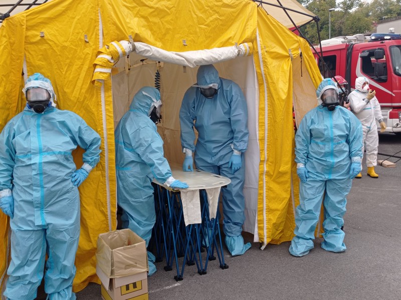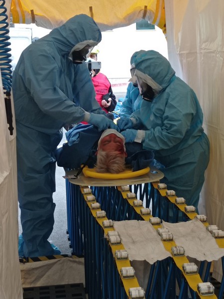 Qui entrano in gioco i sanitari, con maschere, respiratori e le necessarie misure di protezione, per attivare i processi di decontaminazione attraverso l’utilizzo dell’acqua. Solo a questo punto le vittime dell’incidente possono essere consegnate ad altro personale sanitario, a questo punto nella zona gialla, per l’avvio dei trattamenti necessari nel Punto medico avanzato.