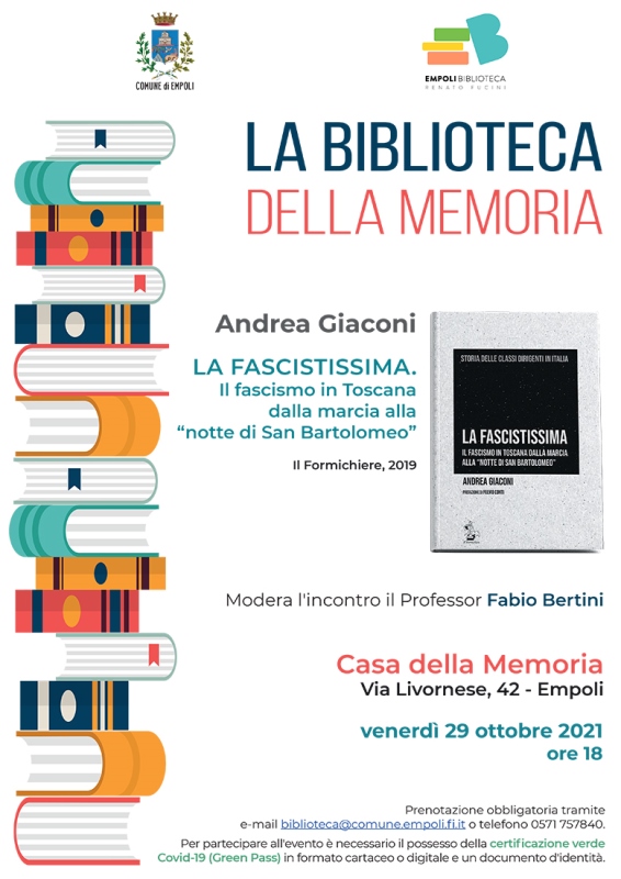 Il primo evento in programma è la presentazione del libro di Andrea Giaconi, intitolato ‘La fascistissima. Il fascismo in Toscana dalla marcia alla “notte di San Bartolomeo’ (Il Formichiere, 2019), che si terrà venerdì 29 ottobre 2021, alle 18, alla Casa della Memoria, in via Livornese 42.