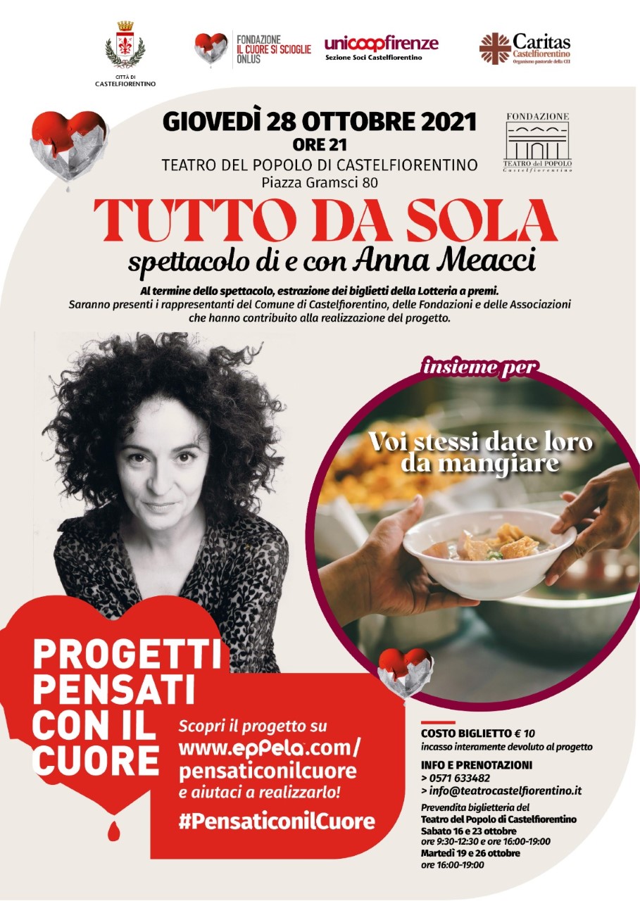 Vieni a Teatro, trascorrerai una bella serata e in più aiuterai la Caritas. E’ questo lo spirito dell’iniziativa “Tutto da sola”, spettacolo di e con Anna Meacci, che si svolgerà al Teatro del Popolo di Castelfiorentino giovedì 28 ottobre 2021, alle ore 20.30 (ingresso 10 euro). Il ricavato della serata servirà infatti a finanziare l’acquisto di nuove attrezzature per la cucina della Caritas, nell’ambito di un progetto “pensato con il cuore” promosso dalla sezione soci Coop di Castelfiorentino, dalla Caritas e dalla Fondazione “Il Cuore si scioglie” (in collaborazione con il Comune di Castelfiorentino) con l’obiettivo appunto di potenziare la Mensa, dove quotidianamente vengono preparati i pasti per le persone bisognose.