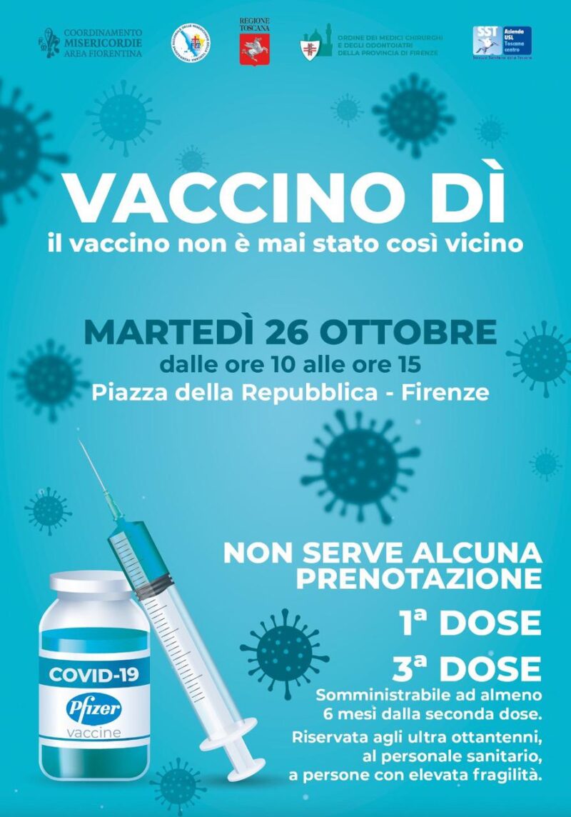 Domani, martedì 26 ottobre in piazza Repubblica a Firenze dalle 10 alle 15 l'iniziativa “Vaccino dì”, lanciata da Ordine dei Medici, Federazione Regionale Misericordie della Toscana e Coordinamento Misericordie Area Fiorentina e sostenuta da Regione Toscana e Usl Toscana Centro