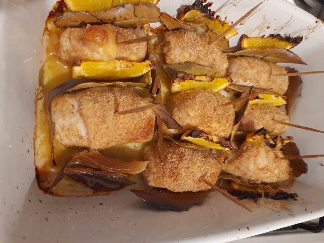 Mettete sul tagliere le fettine di pollo e salatele e pepatele secondo i vostri gusti. Farcite ogni fetta con una fettina di pancetta e un pezzetto di scamorza bianca, quindi arrotolate il pollo, rimboccando anche i lati della fetta, fino ad ottenere un involtino. Passate adesso gli involtini nel pangrattato fino a ricoprirli interamente. Posizionate gli involtini in una pirofila da forno leggermente unta d'olio, quindi tra ogni involtino mettete le foglie di alloro e qualche fettina di arancia. Vi consiglio di usare una teglia “piccola” in modo tale che gli involtini siano ben stretti fra loro e che si sostengano l'uno con l'altro. Irrorate gli involtini con un po' d'olio d'oliva, quindi cuoceteli in forno preriscaldato a 200° per 30 minuti, magari azionando la funzione grill 5 minuti prima di sfornarli. Gli involtini di pollo saporiti sono pronti! Sono ottimi sia mangiati caldi che a temperatura ambiente!