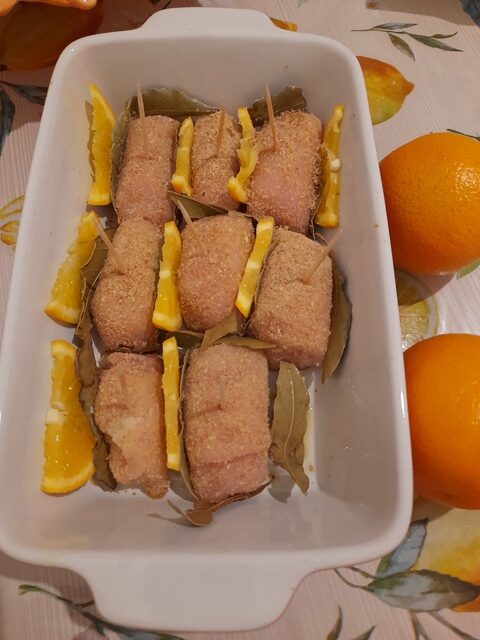 Mettete sul tagliere le fettine di pollo e salatele e pepatele secondo i vostri gusti. Farcite ogni fetta con una fettina di pancetta e un pezzetto di scamorza bianca, quindi arrotolate il pollo, rimboccando anche i lati della fetta, fino ad ottenere un involtino. Passate adesso gli involtini nel pangrattato fino a ricoprirli interamente. Posizionate gli involtini in una pirofila da forno leggermente unta d'olio, quindi tra ogni involtino mettete le foglie di alloro e qualche fettina di arancia. Vi consiglio di usare una teglia “piccola” in modo tale che gli involtini siano ben stretti fra loro e che si sostengano l'uno con l'altro. Irrorate gli involtini con un po' d'olio d'oliva, quindi cuoceteli in forno preriscaldato a 200° per 30 minuti, magari azionando la funzione grill 5 minuti prima di sfornarli. Gli involtini di pollo saporiti sono pronti! Sono ottimi sia mangiati caldi che a temperatura ambiente!