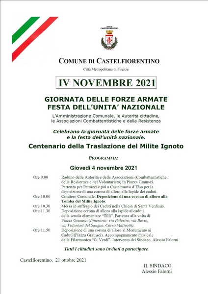 Giovedì 4 novembre anche a Castelfiorentino si celebra la Festa delle Forze Armate e dell’Unità Nazionale, che quest’anno coincide con il Centenario del trasporto del “Milite Ignoto” da Aquileia a Roma (Altare della Patria). Un evento che segnò il passaggio dalla celebrazione della Vittoria, ottenuta dall’Italia durante la “Grande Guerra 1915/1918”, alla elaborazione del lutto collettivo e alla sacralizzazione del culto dei caduti, che avrebbe trovato una più ampia attuazione con la realizzazione in tutta Italia di centinaia di Monumenti ai Caduti e dei “Parchi della Rimembranza”.Come si ricorderà, la salma del “Milite ignoto” fu scelta ad Aquileia da una donna (Maria Bergamas) che aveva perduto il figlio durante la guerra. Di fronte a undici bare senza nome, la madre ne scelse una che rappresentava simbolicamente non solo suo figlio Antonio, ma tutti i figli delle madri d’Italia che avevano subito le conseguenze devastanti di quella tragedia bellica. Da lutto individuale e familiare, il “Milite ignoto” diventò così la celebrazione di un “lutto di massa”: il trasporto del “Milite Ignoto lungo la linea ferroviaria (passando per Venezia, Bologna, Firenze, fino a Roma) fu accompagnata ovunque da una grande partecipazione popolare, che rese omaggio al convoglio (il quale andava a velocità molto ridotta) con un sentimento collettivo di autentica commozione.Anche a Castelfiorentino, come in altri Comuni italiani, il Consiglio Comunale ha deliberato all’unanimità quest’anno (13 maggio 2021) il conferimento della Cittadinanza onoraria al “Milite Ignoto”, raccogliendo un invito del presidente dell’ANCI, Antonio Decaro. E giovedì 4 novembre sarà deposta una corona di alloro anche alla tomba del “Milite Ignoto” che si trova nel Cimitero Comunale di Castelfiorentino.Questo il programma delle celebrazioni. Alle ore 9.00 è previsto il raduno in Piazza Gramsci delle autorità e delle associazioni (combattentistiche, della Resistenza e del volontariato) e la partenza alla volta di Petrazzi e poi a Castelnuovo d’Elsa per la deposizione di una corona di alloro alla lapide dei caduti; a seguire (ore 10.00) la deposizione di una corona di allora alla tomba del “milite ignoto” del Cimitero Comunale. Alle 10.30 si svolgerà la messa in suffragio dei caduti alla Chiesa di Santa Verdiana e, alle 11.30, la deposizione di una corona di alloro alla lapide dei caduti della scuola elementare “Tilli”. Da qui inizierà un breve corteo fino a Piazza Gramsci (via Palestro, via Bovio, via Volontari del Sangue, Corso Matteotti) per la deposizione di una corona di alloro al Monumento ai Caduti. Previsto l’accompagnamento del trombettiere della Filarmonica “G. Verdi” e l’intervento del Sindaco, Alessio Falorni.