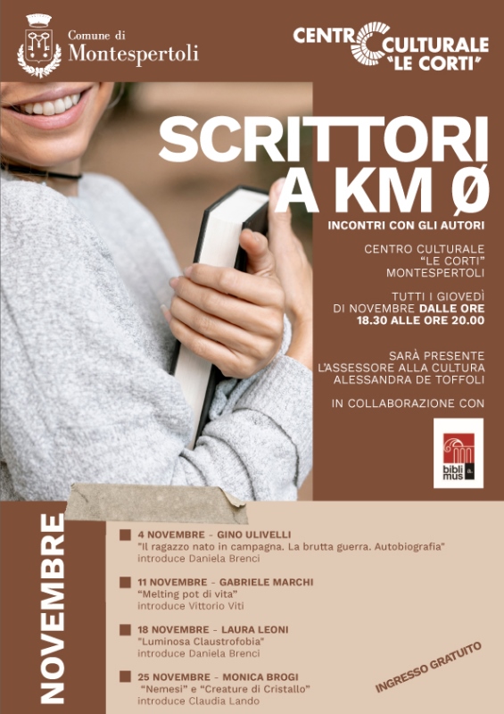 Tutti i giovedì sera (dalle ore 18.30 alle ore 20.00) di novembre, Montespertoli incontrerà e potrà confrontarsi con gli scrittori locali all’interno dell’iniziativa "Scrittori a km 0".