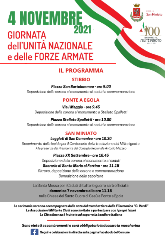 La seconda parte della cerimonia si svolge a San Miniato e si apre alle 10.30 con la scopertura della lapide che verrà collocata ai Loggiati di San Domenico, in occasione del centenario della traslazione del Milite Ignoto, alla presenza del presidente del consiglio regionale Antonio Mazzeo. Alle 10.45, in Piazza XX settembre, sarà deposta una corona al monumento ai caduti, per concludere la mattinata al Sacrario di Santa Maria al Fortino dove, alle 11.15, è prevista la deposizione della corona e la celebrazione della messa per i caduti. Nella chiesa del Sacro Cuore di Gesù a Ponte a Egola, domenica 7 novembre, alle 11.30, sarà officiata una funzione religiosa per i caduti.