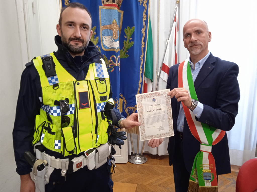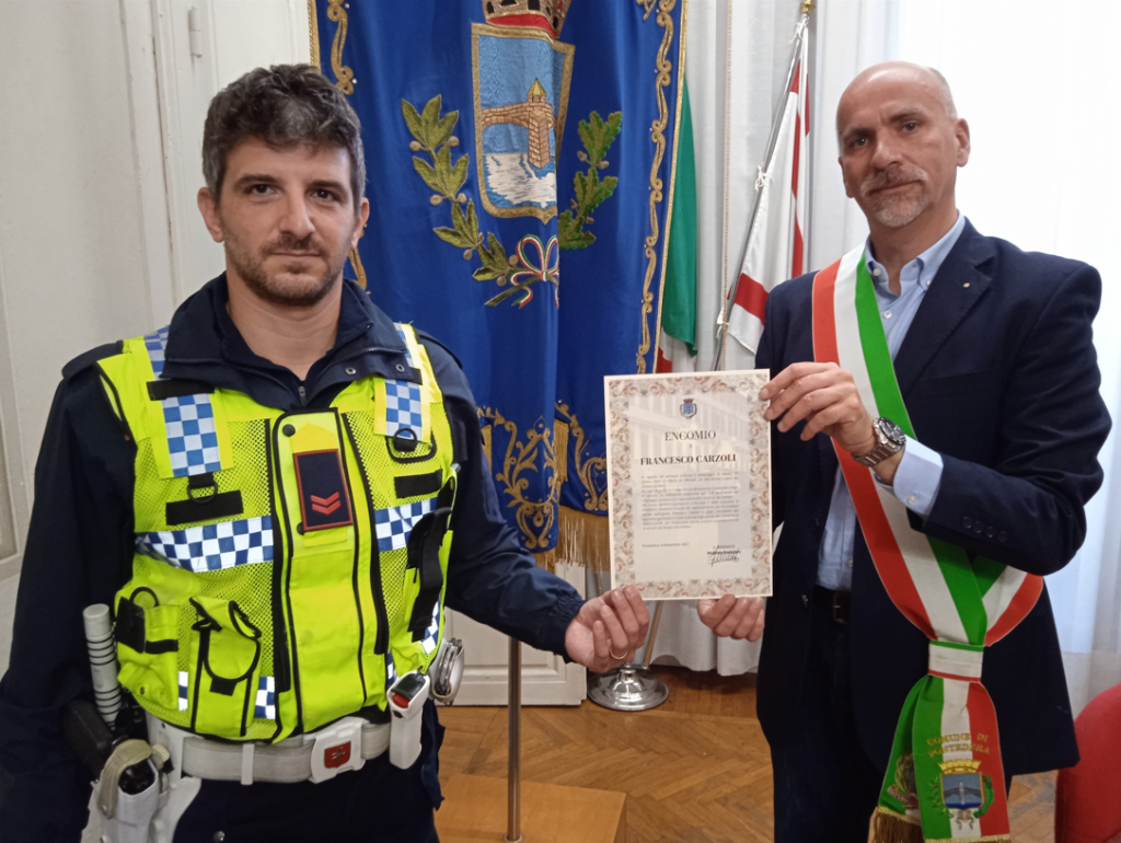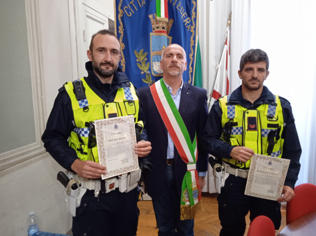 Il vicesindaco di Pontedera Alessandro Puccinelli ha consegnato un encomio ai due agenti della Polizia Locale che il 18 Ottobre scorso salvarono la vita ad una donna colpita da infarto e soccorsa, in stato di incoscienza in zona piazza del Mercato.