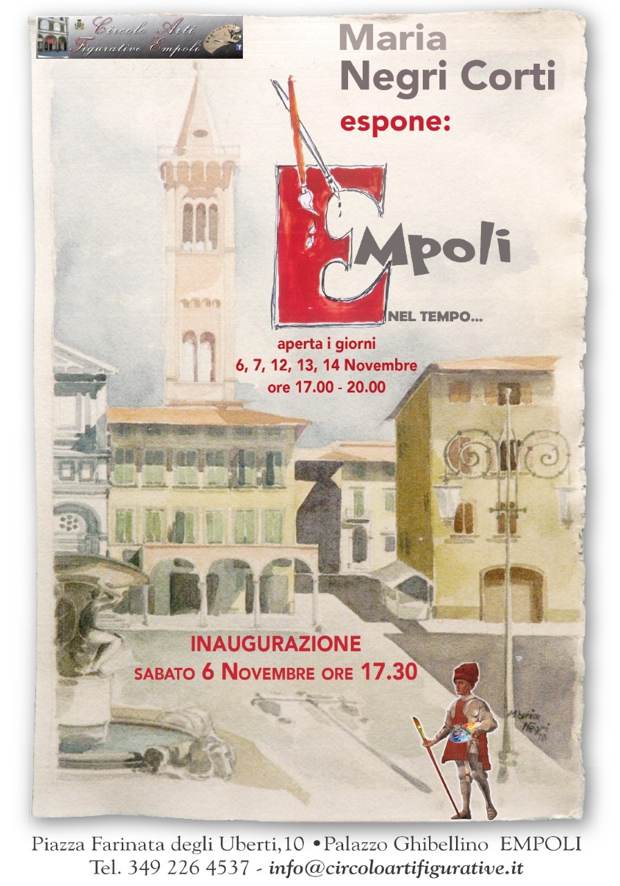 Si inaugura sabato 6 novembre alle 17,30 al Circolo Arti Figurative del Palazzo Ghibellino la mostra di Maria Negri Corti che ha iniziato gli studi presso l’Accademia di Brera sotto la scuola di Casorati. Ha insegnato in molte scuole e dagli anni ‘60 si è trasferita ad Empoli per amore, non certo solamente della città, ma per l’empolese Maurizio Corti.