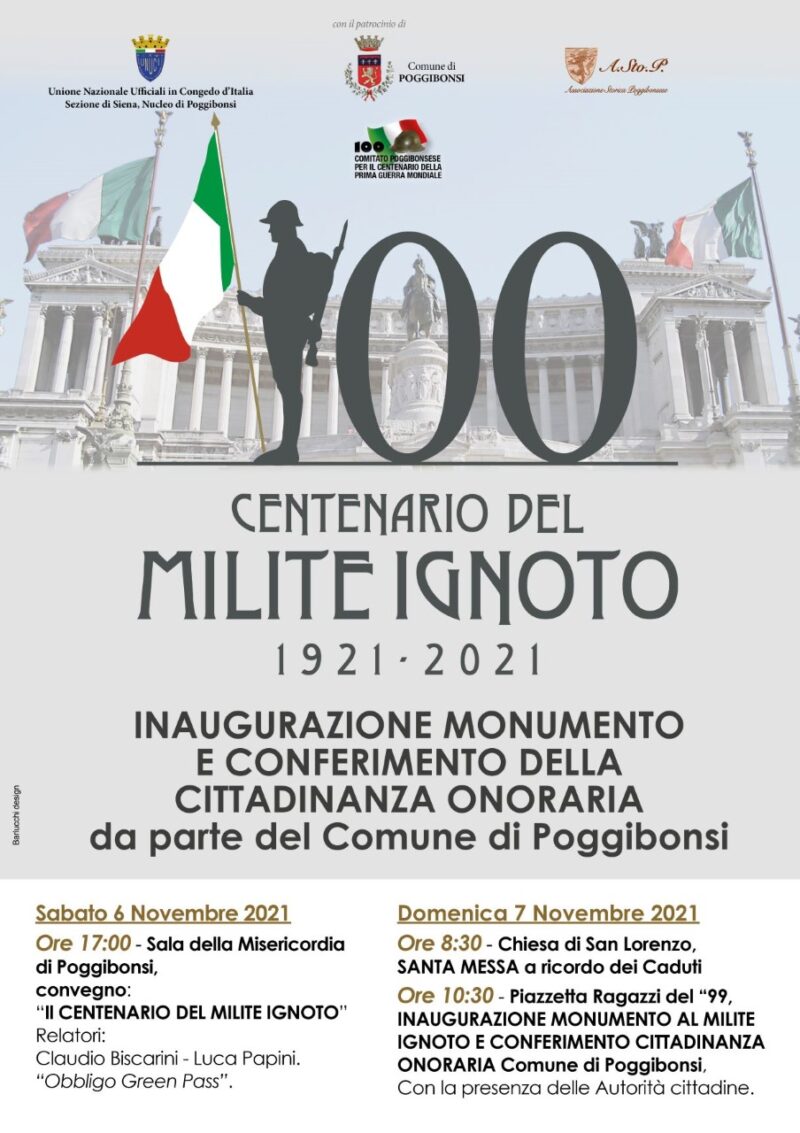 Si svolgerà nel finesettimana la cerimonia promossa dall’Associazione Storica Poggibonsese (Astop) e dalla Sezione di Siena dell’Unione Nazionale Ufficiali in Congedo d’Italia (Unuci), nucleo di Poggibonsi, per il centenario del Milite Ignoto, al ricordo del quale l’Amministrazione Comunale ha decretato la cittadinanza onoraria, conferita con atto di Consiglio Comunale che ha recepito gli impegni approvati su una specifica mozione.Le celebrazioni inizieranno sabato 6 novembre quando, grazie alla disponibilità dell’Arciconfraternita di Misericordia poggibonsese, ci sarà il convegno dedicato a “Il centenario del Milite Ignoto”, una conversazione di Claudio Biscarini, per Astop, e di Luca Papini, per Unuci, con argomento la vicenda che portò alla scelta del Caduto che sarebbe diventato, pare su proposta di Gabriele D’Annunzio, l’Ignoto Milite, decorato di Medaglia d’Oro al Valor Militare, sepolto nel Vittoriano a Roma il 4 novembre 1921. La serata si svolgerà, a partire dalle 17, nella sala della Misericordia.Domenica 7 novembre, alle 8,30, nella chiesa di San Lorenzo che custodisce la lapide che riporta i nomi dei Caduti della città nella Grande Guerra, ci sarà la Santa Messa in ricordo. Quindi, le autorità e i rappresentanti di Astop e Unuci si sposteranno in piazzetta “Ragazzi del ’99” dove ci sarà l’inaugurazione di un monumento dedicato al Milite Ignoto e la celebrazione ufficiale della cittadinanza onoraria conferita. Sarà presente il sindaco David Bussagli.Le celebrazioni sono promosse insieme al Comitato locale per il centenario della prima Guerra Mondiale, con il patrocinio dell’Amministrazione Comunale.