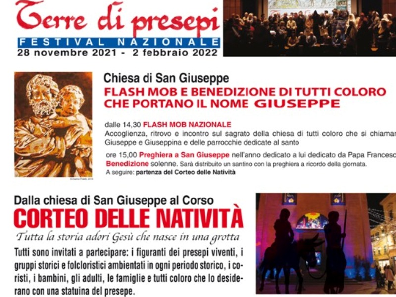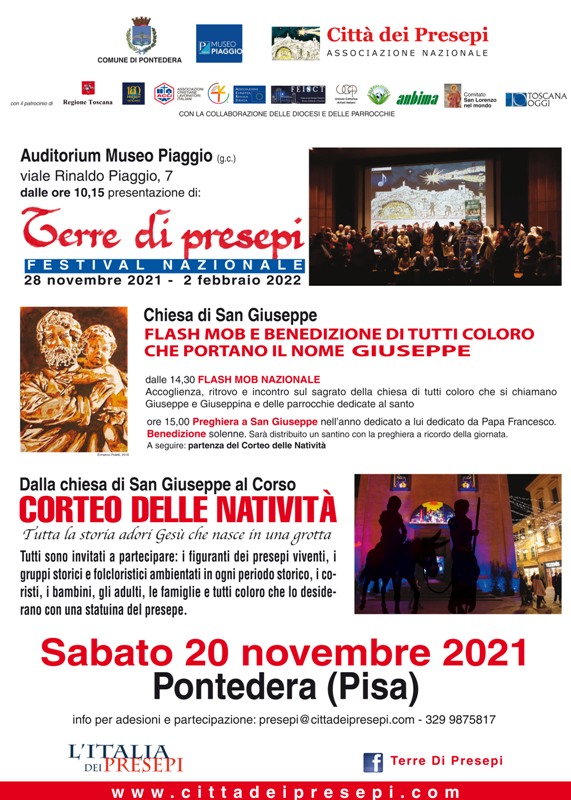 I presepi quest'anno ci saranno e l'Italia dei Presepi ripartirà da Pontedera in provincia di Pisa. Saranno visitabili in tutte le loro espressioni, solo alcune realtà non riescono a superare le difficoltà del momento pandemico, ma l'Italia sarà comunque nel prossimo Natale Terre di Presepi. Il festival nazionale giunto alla settima edizione è la rete presepiale più lunga d'Italia e coinvolge parrocchie, comuni, associazioni, diocesi e presepisti attraverso presepi viventi, vie dei presepi, presepi artistici e nelle chiese, mostre ed esposizioni presepiali. Tutto questo per raccontare il Natale come una Greccio diffusa in ogni luogo. (Chiunque si può iscrivere attraverso il link https://cittadeipresepi.com/iscrivi-il-tuo-presepe/modulo-presepi da ogni parte d'Italia, l'importante è che il presepe sia visitabile e accessibile in sicurezza con le normative covid-19).
