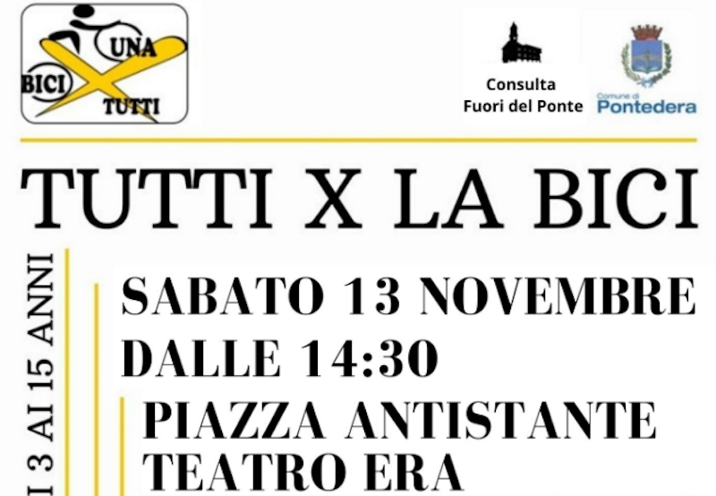 Nuovo appuntamento con "Tutti per la bici". Dopo il primo evento di Sabato 30 Ottobre in zona stazione, l'associazione sportiva "Una Bici per tutti", insieme alla Consulta di Fuori del Ponte e con il patrocinio del Comune di Pontedera, allestirà ancora una volta un percorso di abilità per sperimentare la guida sulle due ruote per bambini e ragazzi dai 3 ai 15 anni. Il luogo è la piazza antistante al Teatro Era, l'orario di ritrovo è quello delle 14,30, il giorno è Sabato prossimo, 13 Novembre. Ci saranno biciclette di varie misure e caschi protettivi e i ragazzi saranno seguiti da tecnici della Federciclismo.
