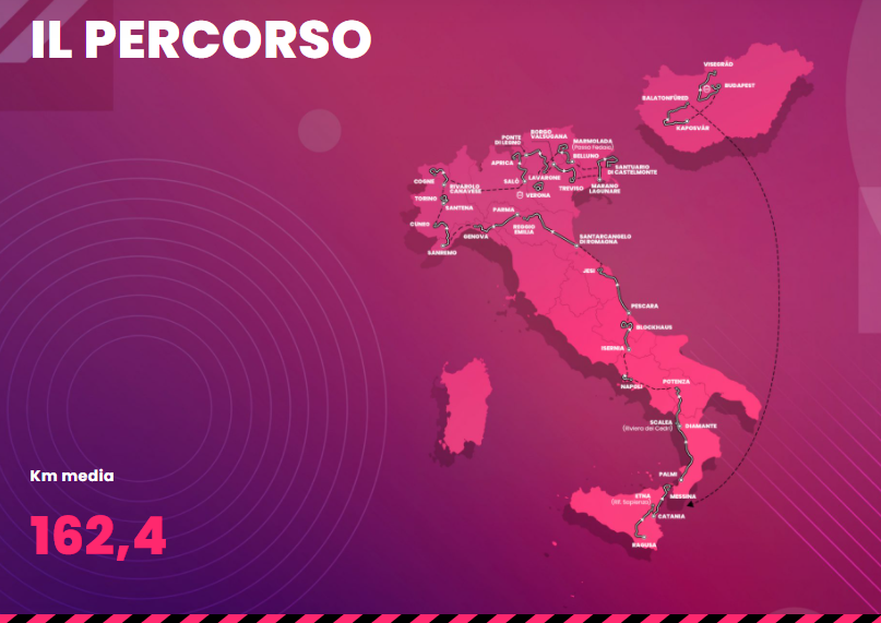 Per il Giro d'Italia 2022 ci saranno 3 tappe 'estere' in Ungheria tra Budapest e Visengrad, per poi ripartire dalla Sicilia, salendo su per la Calabria e la Basilicata. Una tappa sarà interamente dedicata a Napoli, poi il passaggio dal Molise a Isernia. Da lì i ciclisti passeranno per le regioni affacciate sull'Adriatico: Abruzzo, Marche ed Emilia Romagna, evitando tutto ciò che sta al di là degli Appennini come la Toscana. La tappa Parma-Genova sfiorerà la nostra regione senza oltrepassarla, passando poi dal Piemonte alla Valle d'Aosta. E ancora la Lombardia, il Trentino con la Valsugana, infine il Veneto con la conclusione a Verona.