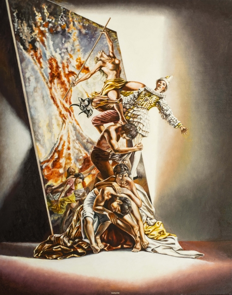Un pittore dei sentimenti e delle emozioni che non ha mai rinunciato al privilegio di dipingere ciò che vede, percepisce, sente per costruire una personalissima architettura dell'anima che si nutre di pathos in movimento, abitata da piramidi di corpi, leggeri, che in linea verticale, tracciano la loro strada alla ricerca della felicità. Sergio Nardoni predilige paesaggi e composizioni reali e metafisici allo stesso tempo, abitati da figure umane che diventano personaggi, segni distintivi, simboli di una perfetta sintesi tra la dimensione figurativa e l'interpretazione dell'irrealtà. Il viaggio di Nardoni, al fianco dei suoi 'personaggi', donne e uomini, apparentemente silenti, distanti ed estranei gli uni rispetto agli altri, avvolti da panneggi di ispirazione classica, arricchisce le sale dello storico Palazzo Malaspina, cuore medievale di San Donato in Poggio. Essi danno forma e voce all'azione dinamica della cultura, affiancati da personaggi in costume, catapultati da un palcoscenico teatrale o circense, tratti da un mondo parallelo fantastico dal sapore retrò. Sono gli ambasciatori nel mondo dell'inconfondibile Nardoni che ricorrono nel lungo cammino culturale del maestro, portati ovunque, nelle scuole, nelle grandi città e università del mondo, dagli Stati Uniti alla Cina, dove il pittore ha esposto e insegnato.