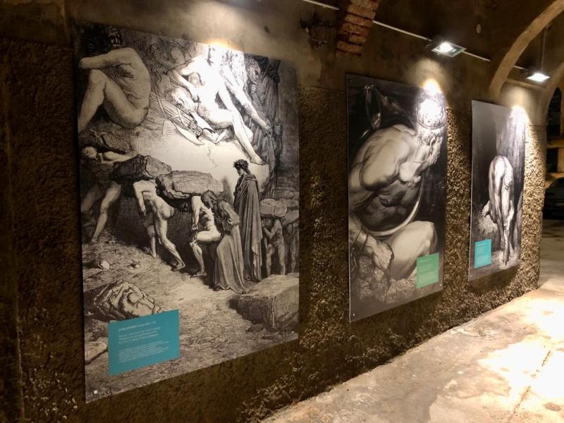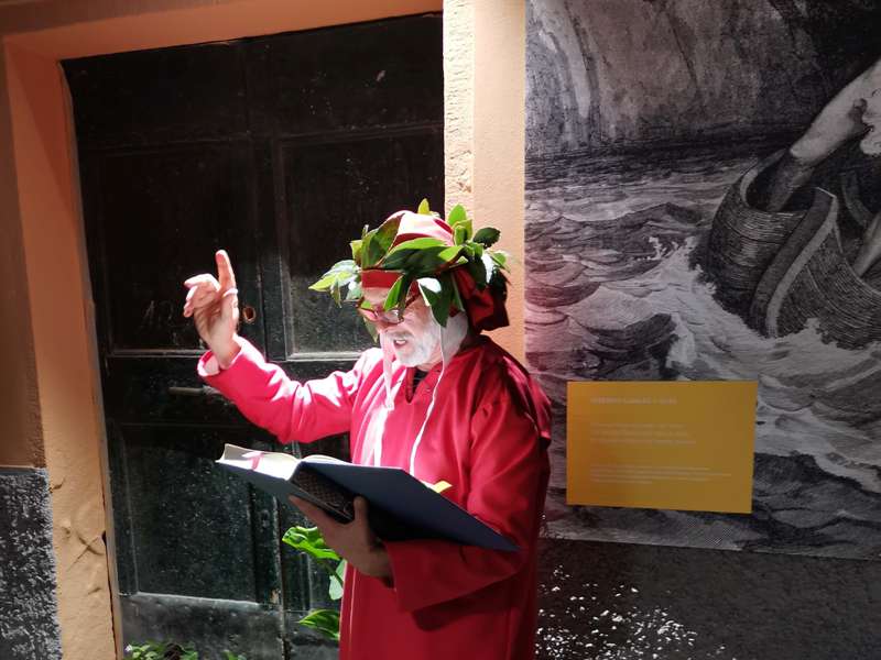 Sabato scorso, 13 novembre, l’esposizione è stata inaugurata con una sorta di visita guidata animata dal gruppo teatrale Four Red Roses. Un attore, nei panni del genio fiorentino, ha declamato le celebri terzine di Dante Alighieri: dal primo canto in cui il protagonista entra nella selva oscura fino alla porta dell’inferno, passando per i personaggi più oscuri degli inferi come Caronte (canto III dell’Inferno), Minosse (canto V) e Cerbero (canto VI), dalle sublimi rime di Paolo e Francesca (canto V) fino all’incontro con Beatrice (canto XXX del Purgatorio).