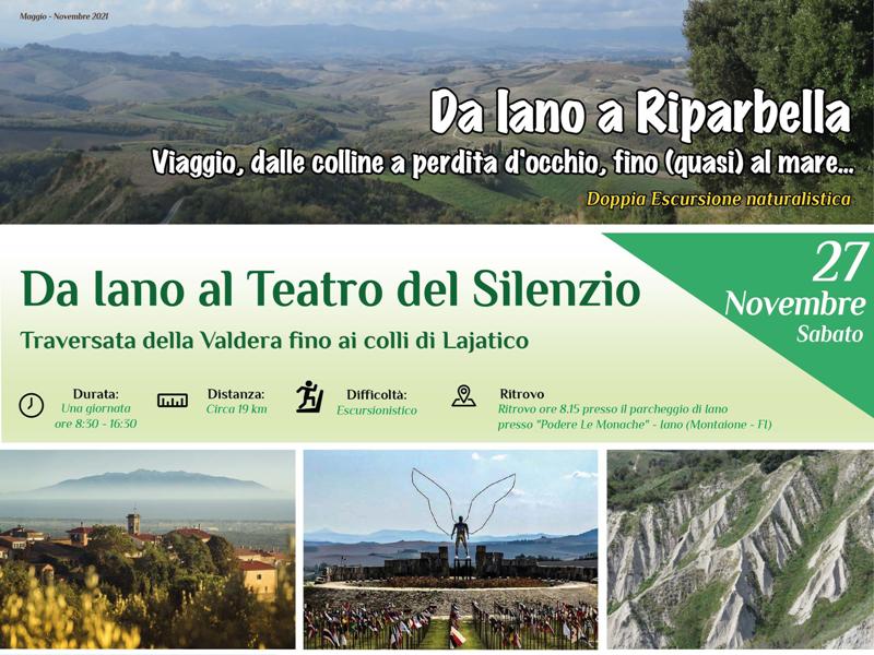 In queste due giornate di escursioni, i partecipanti accompagnati da una guida ambientale, potranno ammirare le principali attrazioni naturali presenti nei territori di Montaione, della Valdera e della Val di Cecina. Sabato 27 Novembre gli escursionisti attraverseranno i carateristici borghi medievali di Cedri e Montelopio, per poi proseguire lungo il fiume Era fino a giungere al Teatro del Silenzio, posto sulle colline di Lajatico.