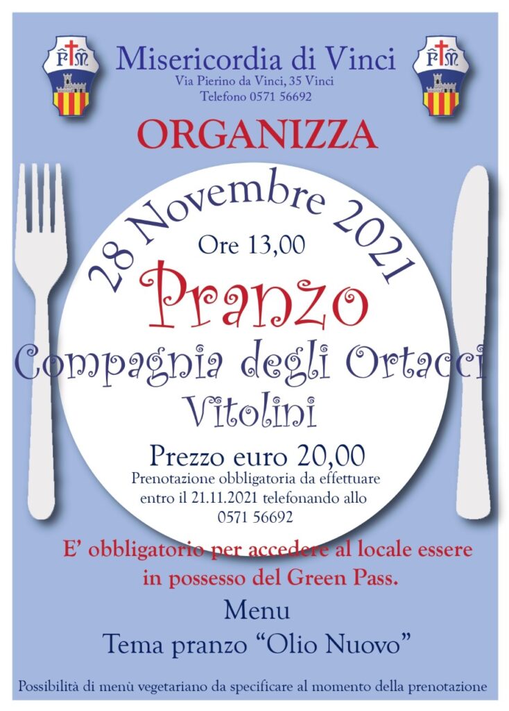 Il 28 novembre, alle ore 13, si terrà il Pranzo alla Compagnia degli Ortacci di Vitolini (20 euro), con menu a tema “Olio Nuovo”. È richiesta la prenotazione obbligatoria entro il 21.11.2021 telefonando allo0571 56692. Previsto anche menu vegetariano.