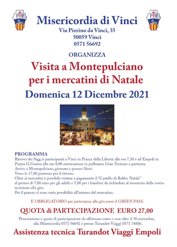 Domenica 12 Dicembre 2021, invece, è stata organizzata una visita a Montepulciano per i mercatini di Natale. Il costo per partecipare è di 27 euro. Prenotazione e quota di partecipazione da effettuare entro e non oltre il 30 novembre, alla Misericordia 0571 56692 o presso Turandot Viaggi 0571 74006.
