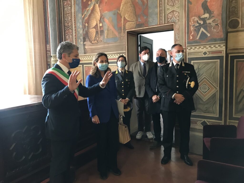 Insediatasi lo scorso 10 novembre, questa mattina il neo prefetto di Pisa Maria Luisa D'Alessandro è venuta a San Miniato per fare visita alla città ed incontrare istituzioni, forze dell'ordine e associazioni. Ad accoglierla, sono stati il sindaco di San Miniato Simone Giglioli insieme ad alcuni consiglieri comunali. Un incontro semplice ed informale quello che si è svolto in Sala del Consiglio e ha visto i saluti di Monya Giarnò vice direttrice regionale di Crédit Agricole Italia, dei rappresentanti della forze dell'ordine, il tenente colonnello dei carabinieri Gennaro Riccardi, il luogotenente Giovanni Alfieri, la comandante della Guardia di Finanza Rosangela Di Lecce e il comandante della Polizia Municipale Dario Pancanti. Presente anche il presidente del Consorzio Conciatori di Ponte a Egola Michele Matteoli.