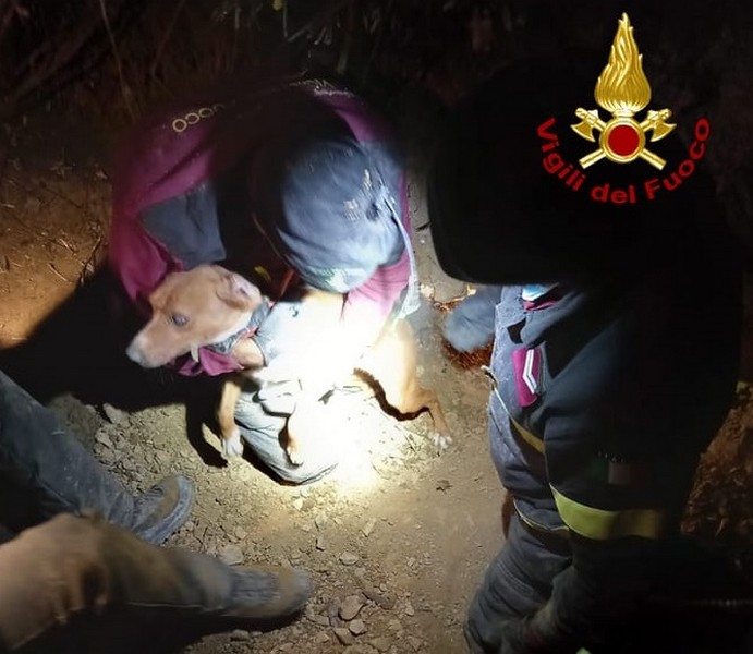 Un cane, rimasto incastrato all'interno di una buca nel terreno, è stato prima individuato e poi liberato dalla squadra vigili del fuoco, che ha poi affidato l'animale incolume al suo proprietario.