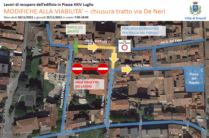 Nelle giornate di mercoledì 24 novembre 2021 e giovedì 25 novembre 2021, dalle 7 di mattina alle 18 per entrambi i giorni, verrà chiuso temporaneamente il primo tratto di Via dei Neri (da PIazza XXIV Luglio a via Da Vinci), per poter svolgere l’attività di installazione di degrassatore e vasca bicamerale nel cortile dell’edificio “Ex Sert”, che accoglierà a breve la nuova casa della salute e il condominio solidale "Freedom".