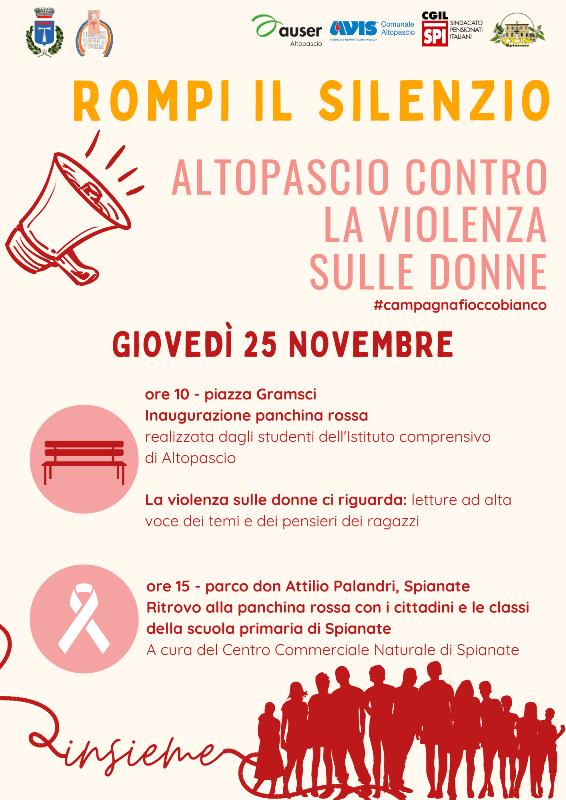 L’appuntamento è per giovedì 25 novembre: la mattina ad Altopascio, in piazza Gramsci, e il pomeriggio a Spianate, al parco don Attilio Palandri. “Rompi il silenzio - Altopascio contro la violenza sulle donne”, questo il titolo dell’iniziativa. Si parte alle 10, in piazza Gramsci, davanti alla scuola media di Altopascio, dove sarà inaugurata la panchina rossa realizzata dai ragazzi della scuola. Nell’occasione si terranno letture in piazza dei temi e dei pensieri preparati dagli studenti stessi, mentre l’Auser, grazie al contributo dello Spi-Cgil, distribuirà magliette e palloncini.